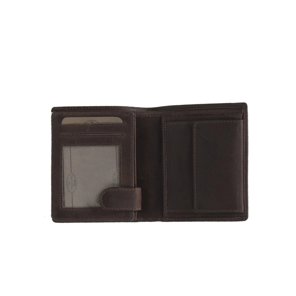 Kožená peněženka z voskované kůže v hnědé barvě nabízí přehledné uspořádání na karty, bankovky i mince. Elegantní a kompaktní doplněk pro každodenní použití.