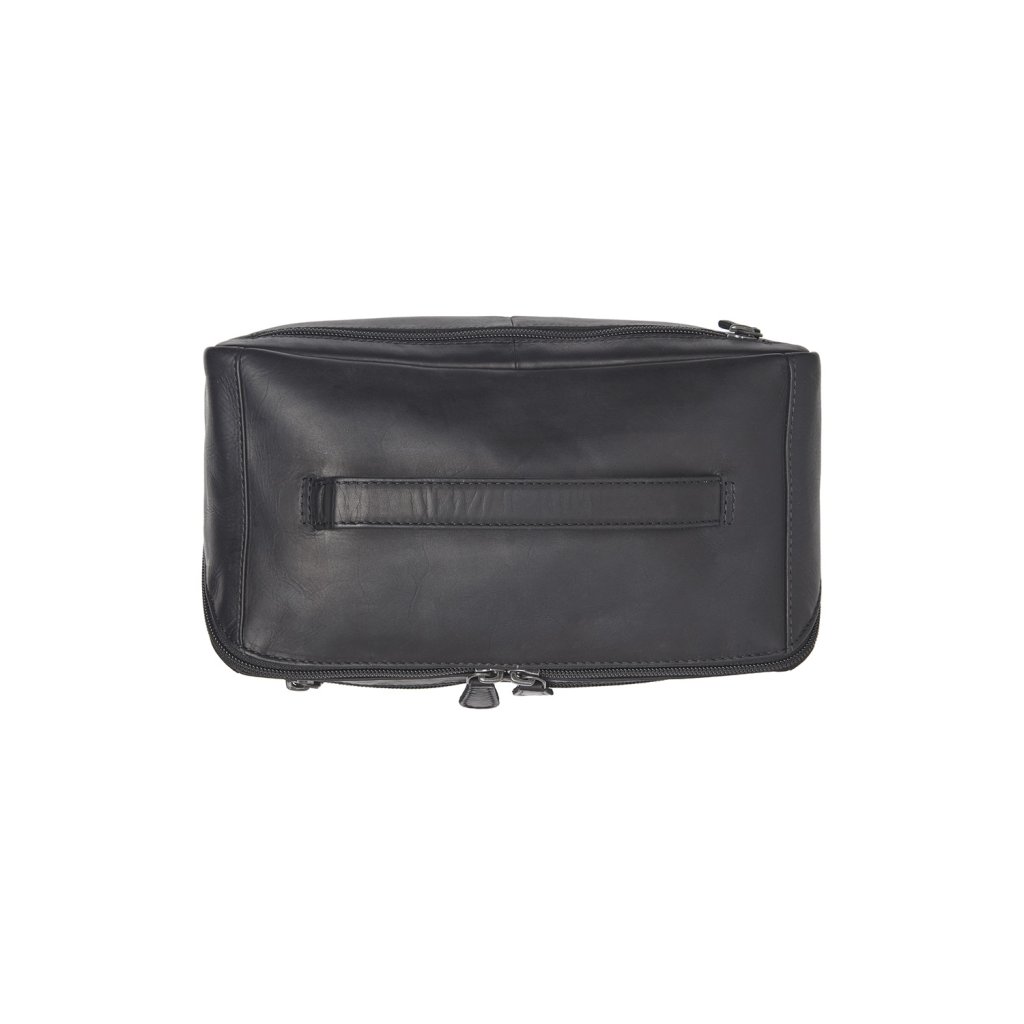 Kožená toaletní taška z voskované kůže v černé barvě nabízí přehledný vnitřní prostor, praktické kapsy na drobnosti a pevné poutko pro snadné přenášení. Elegantní doplněk ideální pro cestování i každodenní používání.