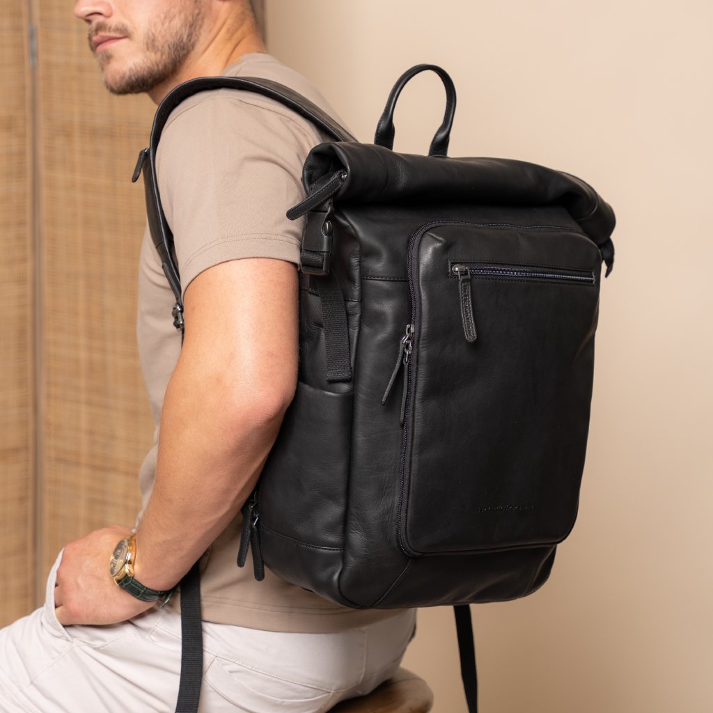 Kožený rolovací batoh z voskované kůže v černé barvě na notebook do 16" nabízí polstrovanou přihrádku, prostorný hlavní oddíl a přední kapsu pro rychlý přístup. Moderní a funkční doplněk vhodný pro práci, městské cestování i každodenní používání.