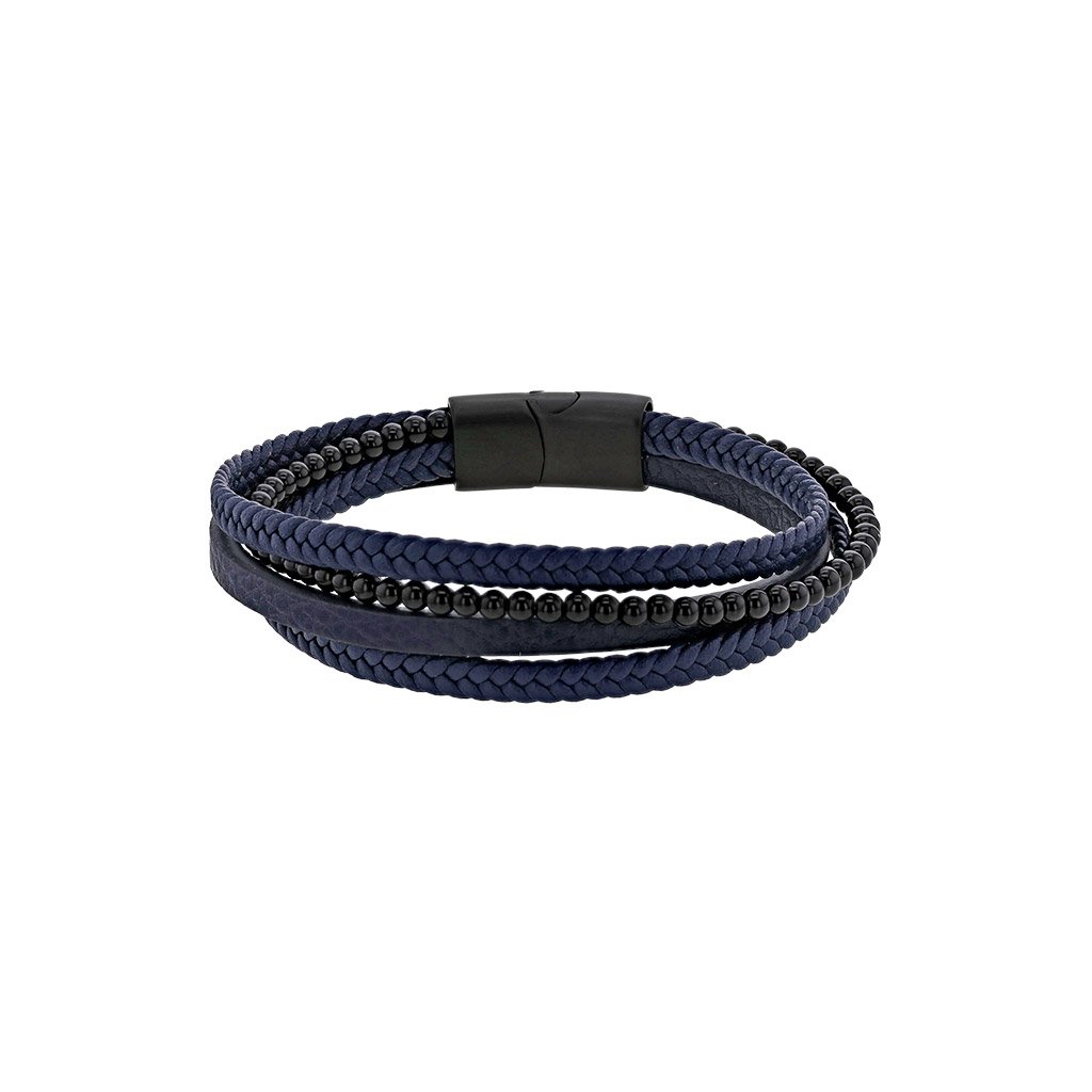 Kožený pánský náramek v černo-modré kombinaci kombinuje hladkou a pletenou kůži s jemnými korálky. Čtyřřadé provedení a ocelové zapínání podtrhují moderní a elegantní vzhled.