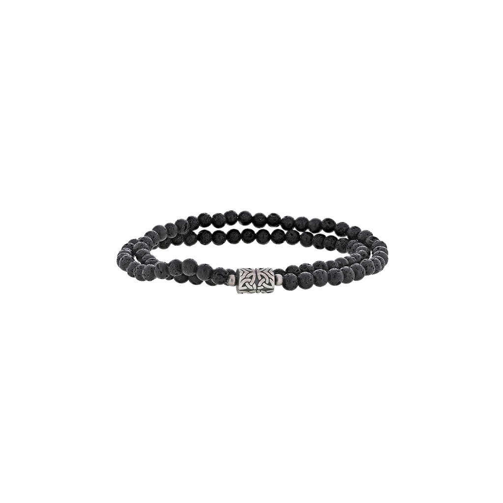 Pánský dvojitý stretchový náramek s lávovými korálky doplněný o ocelový korálek s rytím působí jemně a nenápadně.
