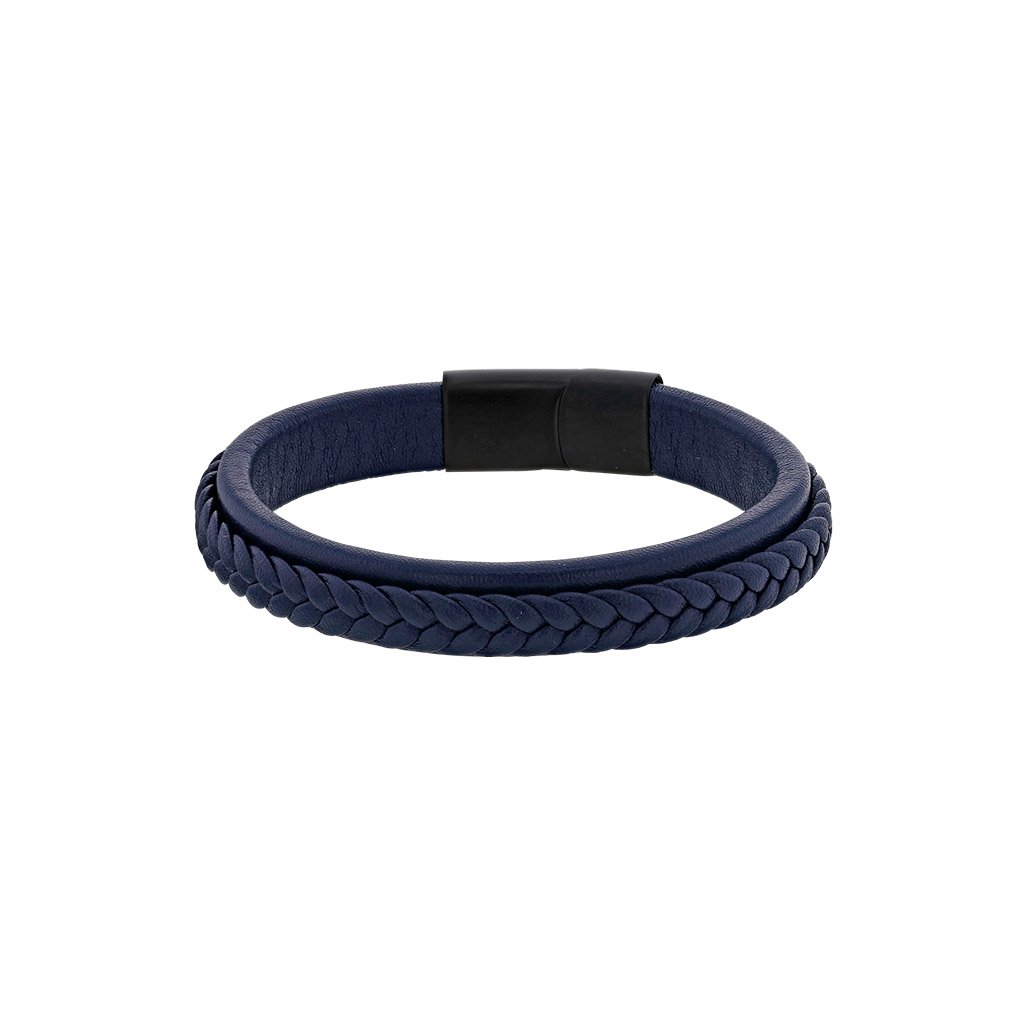 Kožený pánský náramek v námořnicky modré barvě kombinuje hladkou a jemně strukturovanou kůži s černým ocelovým zapínáním pro čistý a nadčasový vzhled.