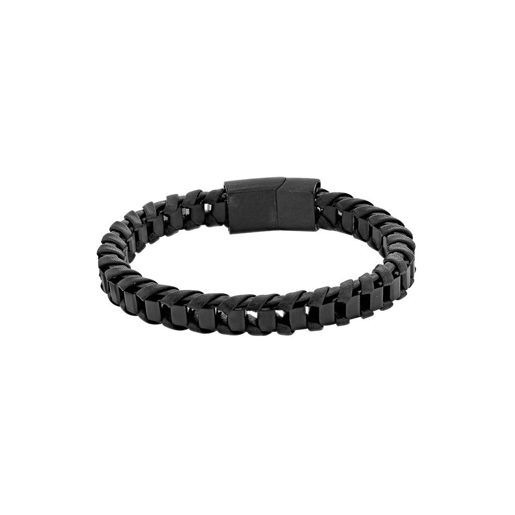 Pánský kožený náramek v černé barvě kombinuje pletenou kůži se zapletenými ocelovými prvky a černým ocelovým zapínáním s magnetem.