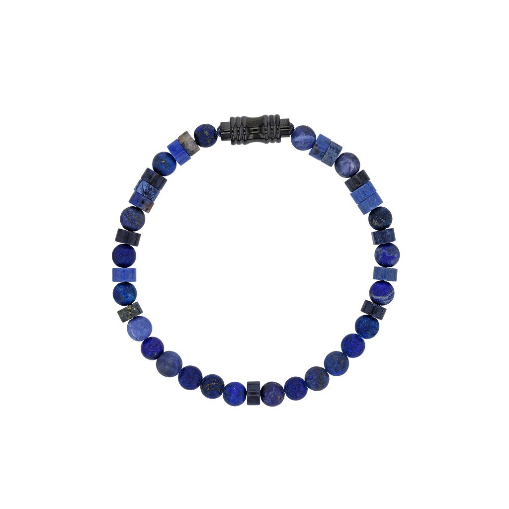 Pánský náramek s lapis lazuli korálky doplněný o ocelový korálek s rytím působí vyváženě a přirozeně a snadno doplní každodenní outfit.