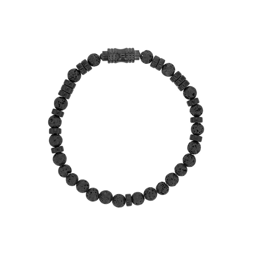 Pánský náramek s lávovými korálky doplněný o ocelový korálek s rytím působí přirozeně a snadno doplní každodenní outfit.