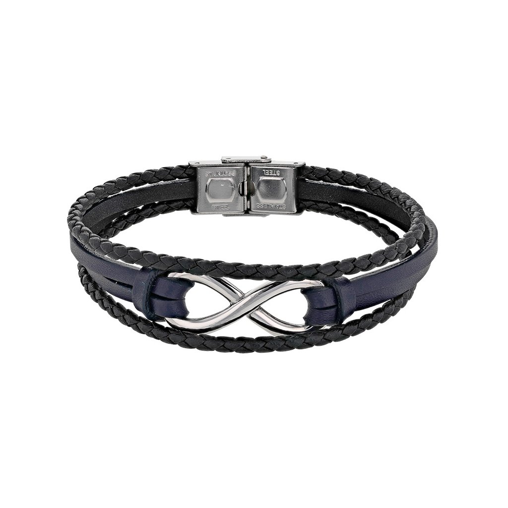 Pánský víceřadý kožený náramek s ocelovým symbolem nekonečna – modro-černá
